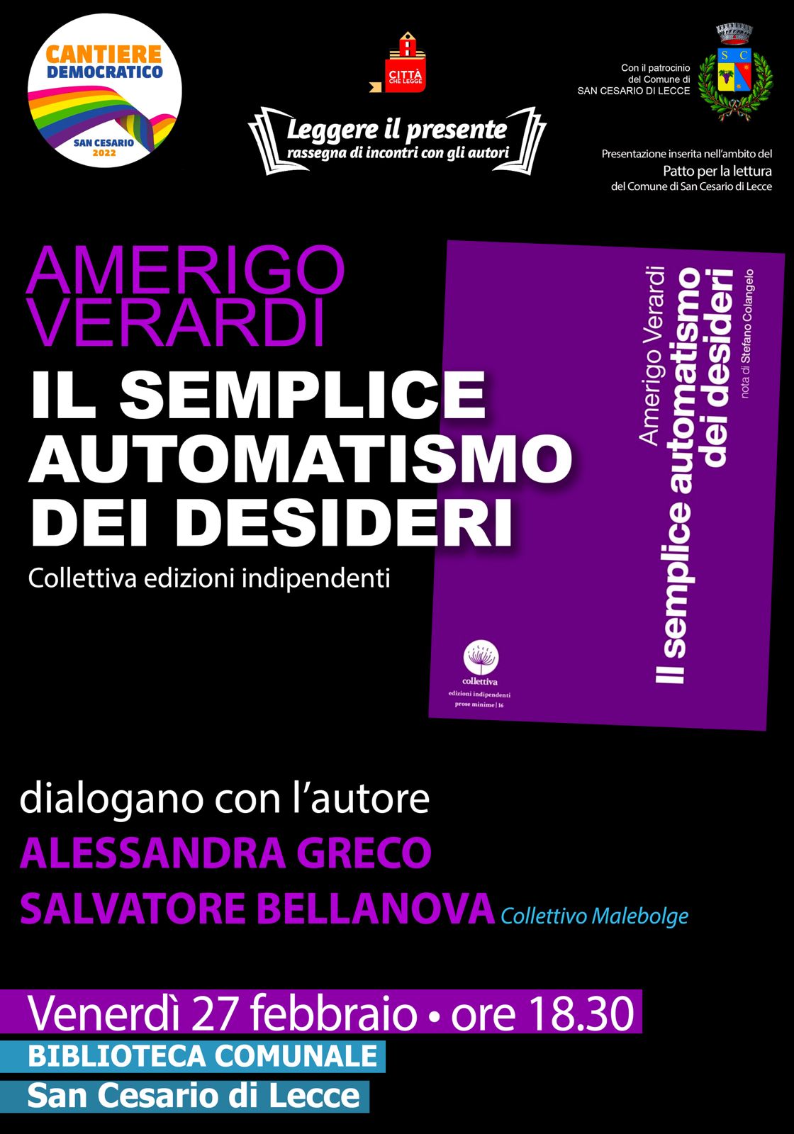 Per “Leggere il presente, rassegna di incontri con gli autori”, nell’ambito del Patto per la lettura del Comune di San Cesario di Lecce, con il patrocinio del Comune di San Cesario di Lecce e in collaborazione con l’Associazione Cantiere Democratico, Amerigo Verardi presenta “Il semplice automatismo dei desideri”. Dialogheranno con l’autore Salvatore Bellanova (Collettivo Malebolge) e Alessandra Greco.