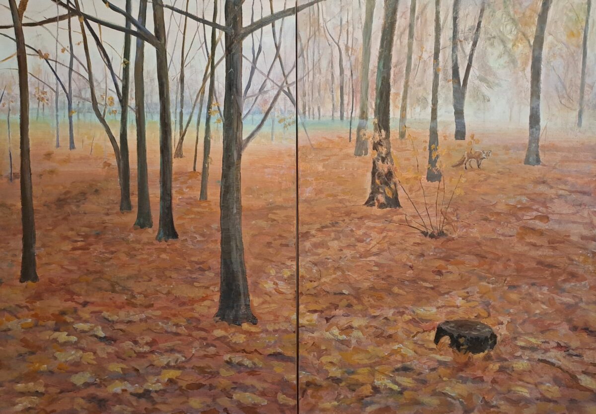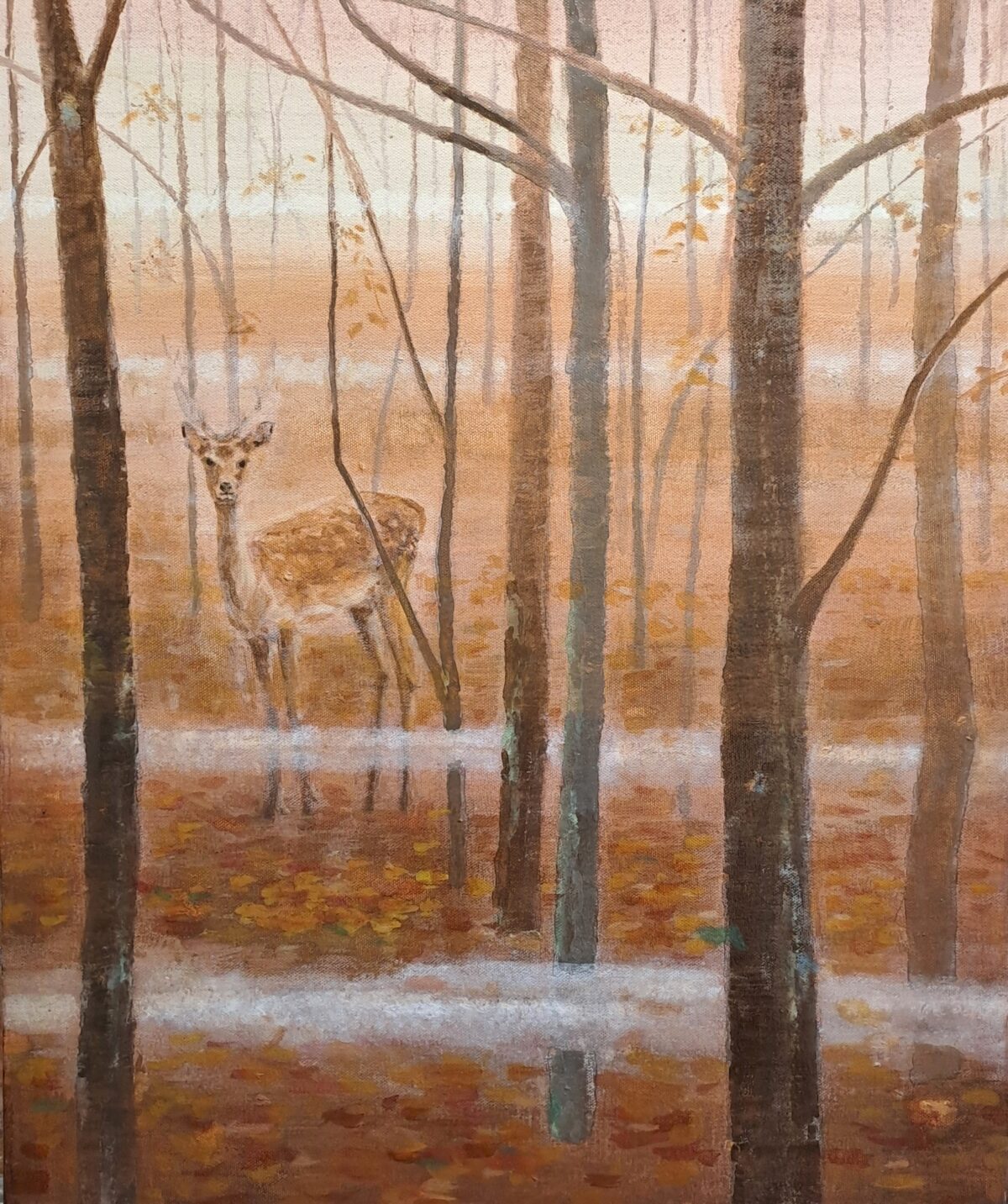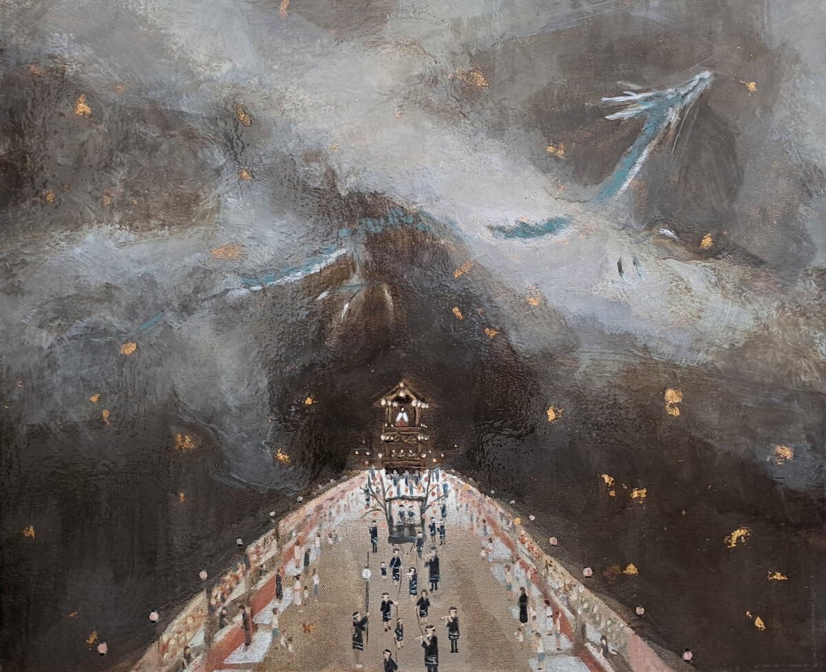 “In questa mostra ho dipinto anche alcuni soggetti dello shintoismo: i draghi sono divinità protettrici dell’acqua e nuotano tra le nuvole; i cervi e le volpi sono messaggeri delle divinità di boschi e montagne. Dipingo gli umani di spalle, ma loro, queste divinità e messaggeri, ci guardano e ci interrogano”